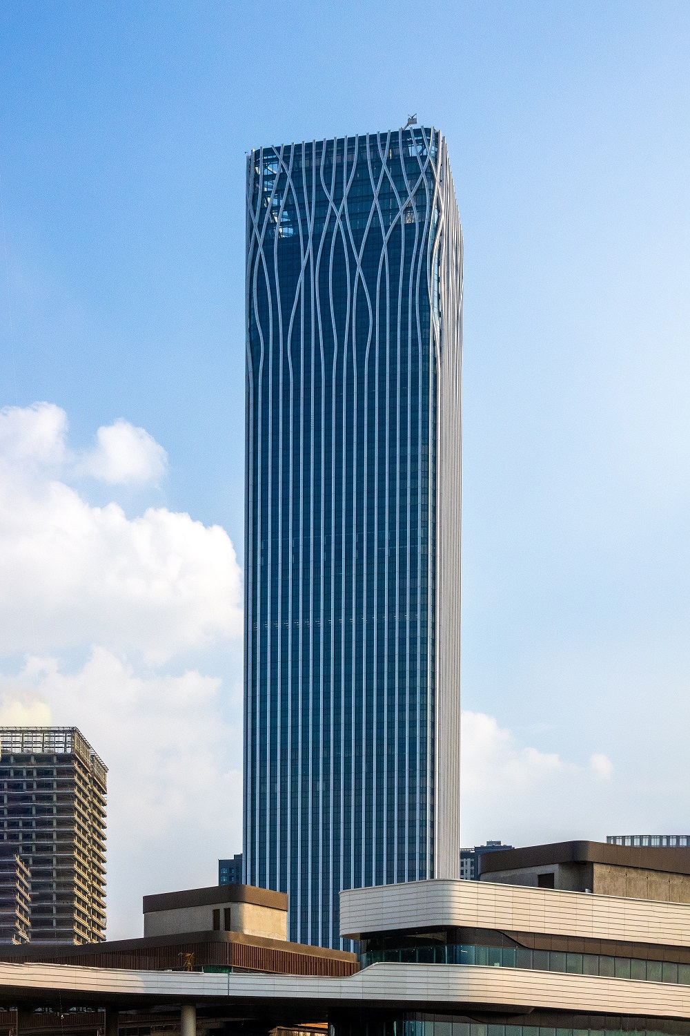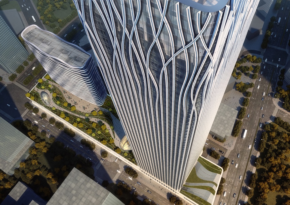 設(shè)計(jì)大師“樹”的設(shè)計(jì)理念突出體現(xiàn)在外立面幕墻。鋁幕線條從6層開始齊頭并進(jìn)直至215米處,之后線條開始不規(guī)則地“開枝散葉”,使得前灘中心看起來更為靈動(dòng)、生機(jī)勃勃。