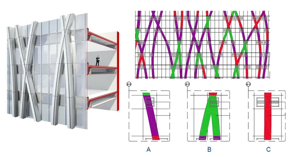 為追求水流的無序美感,塔樓頂端的鋁幕墻裝飾條均為不規(guī)則并伴有交叉的曲線。裝飾條轉(zhuǎn)角部位的鋁幕墻為工藝復(fù)雜雙曲面,項(xiàng)目中最大的一塊單元體線條,零部件數(shù)量超過100個(gè)單體,總面積達(dá)到19㎡,精度誤差要求不超過3mm,且安裝高度超過200米,制作和施工難度可想而知。