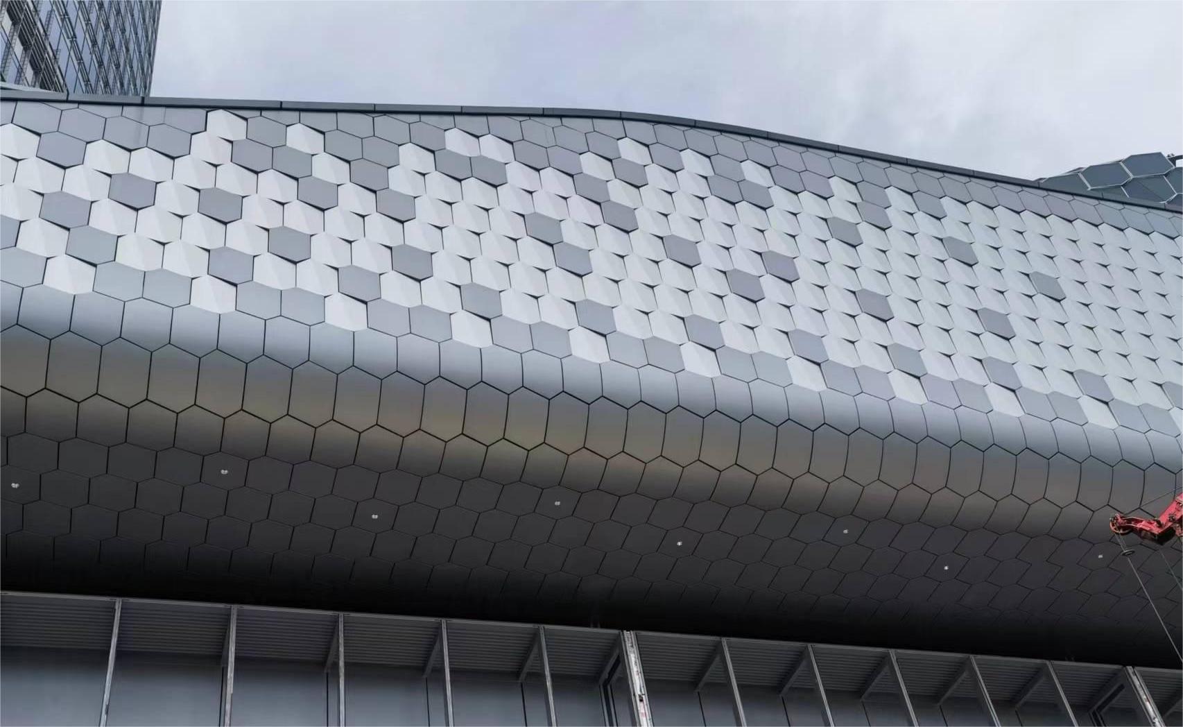 南裙樓船頭造型內(nèi)部鋼結(jié)構(gòu)均有扭轉(zhuǎn),要求拐角幕墻呈現(xiàn)雙曲面效果;屋檐幕墻設(shè)計圍繞龍鱗造型,分解為單片“六邊形”元素展開,拐角弧度造型對鋁板制造及安裝工藝要求極高。